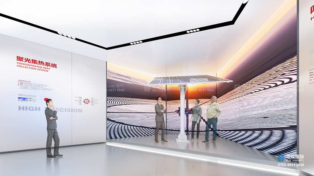 在蒼茫的戈壁灘上一朵盛開的“太陽花”,結合數字場景模型,打造沉浸式情景劇場,營造浩瀚廣袤、生機勃勃的空間氛圍,展示從聚光、集熱、儲熱到發電的全流程塔式光熱發電核心技術,實現了核心裝備的產業化、國產化。