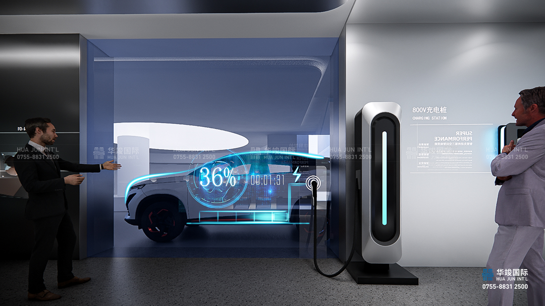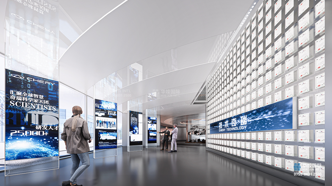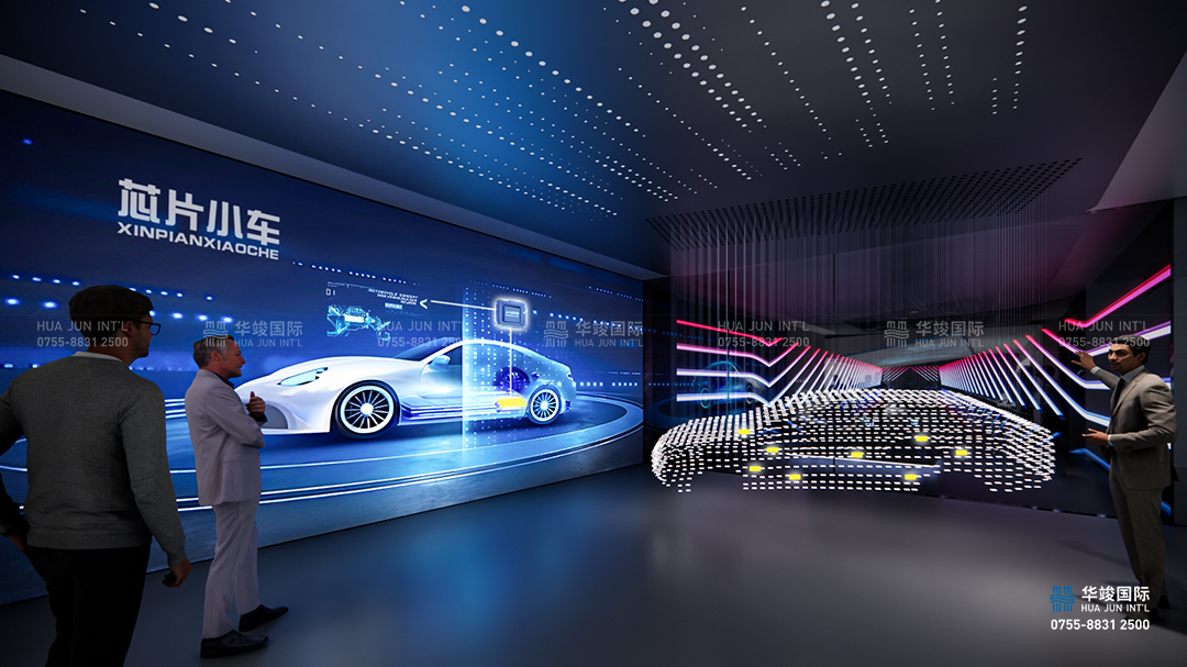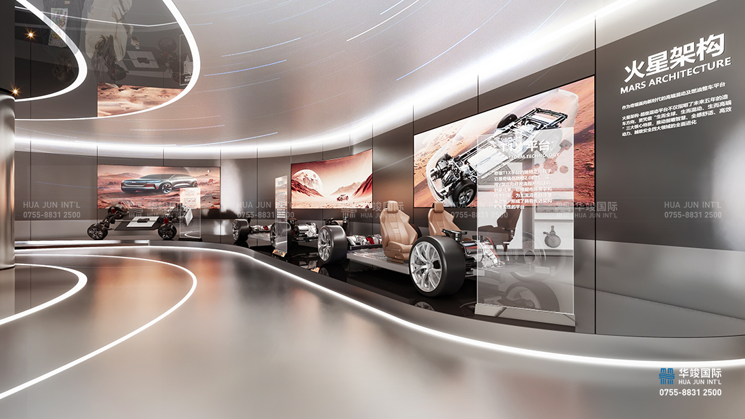 未來技術板塊作為新能源汽車展廳中的創(chuàng)新展示區(qū)域,重點展示未來汽車領域的核心技術與顛覆性創(chuàng)新產(chǎn)品,探索新能源、智能化和未來出行方式的無限可能。在這個區(qū)域,通過環(huán)屏營造出未來世界的想象空間,通過多樣化的技術展示和互動體驗,讓觀眾感受未來汽車的科技魅力與生活方式的全新定義。
